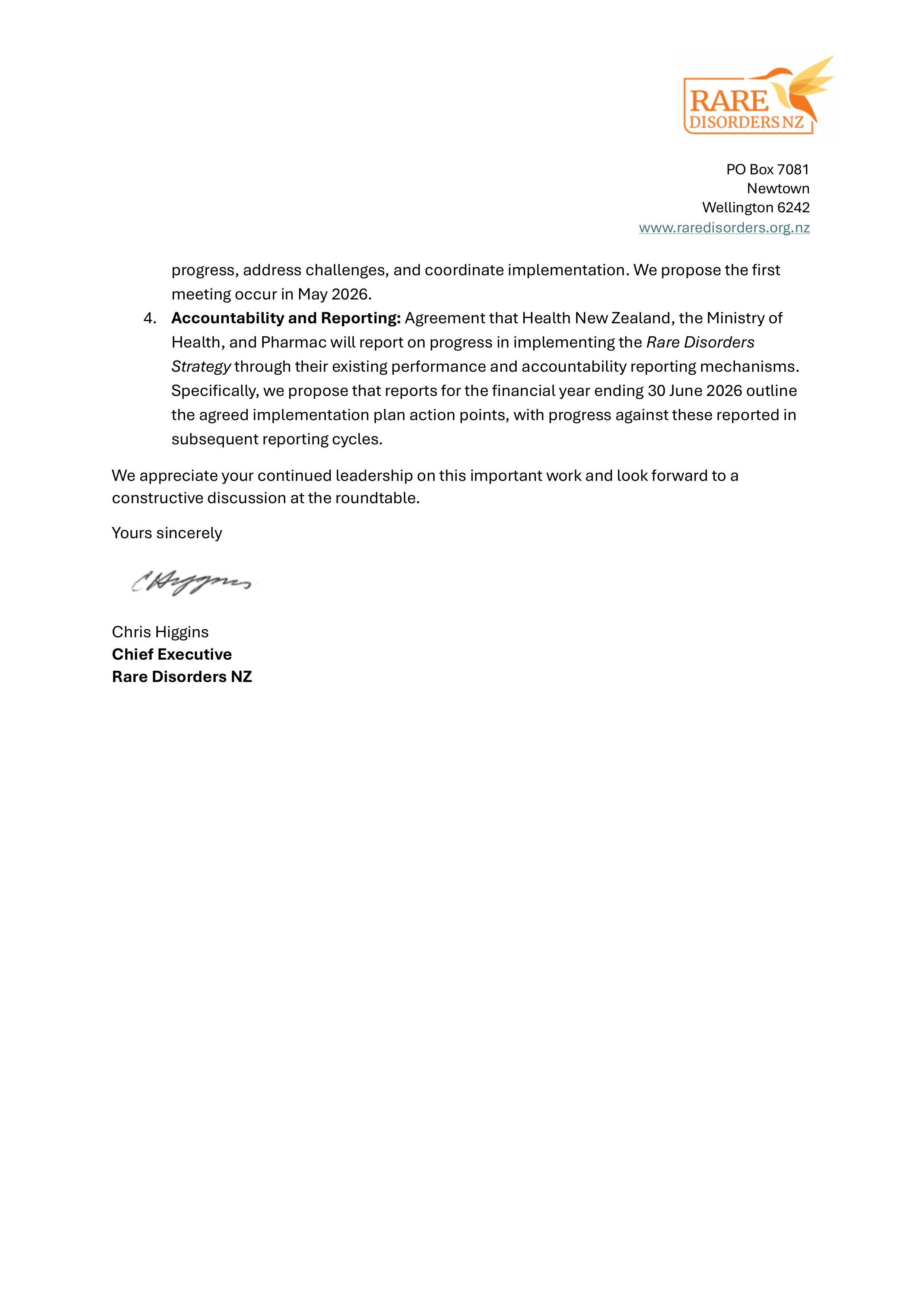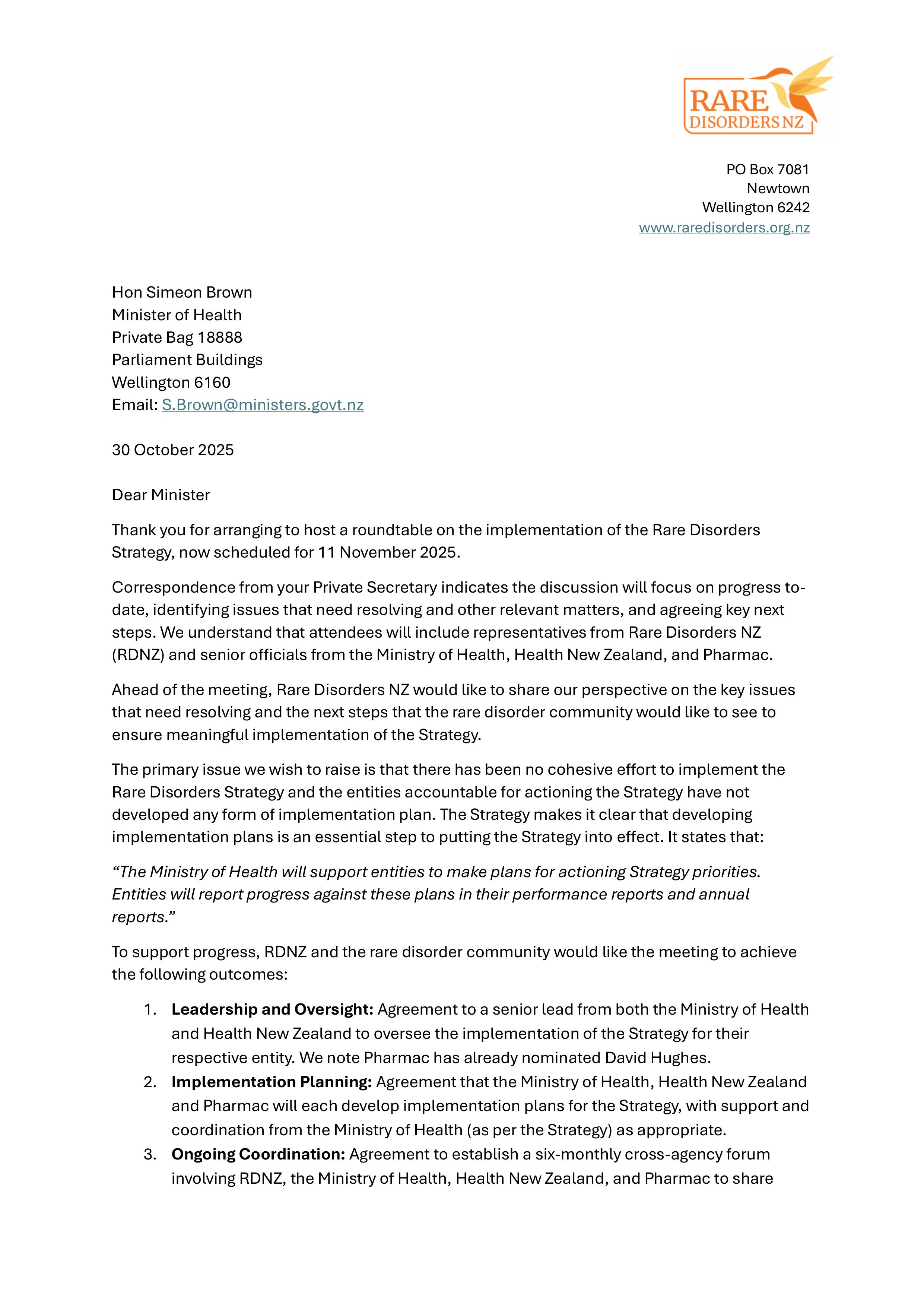 Prior to the meeting, Rare Disorders NZ made our expectations clear and stipulated four outcomes we wanted to see achieved at the meeting in the below letter.