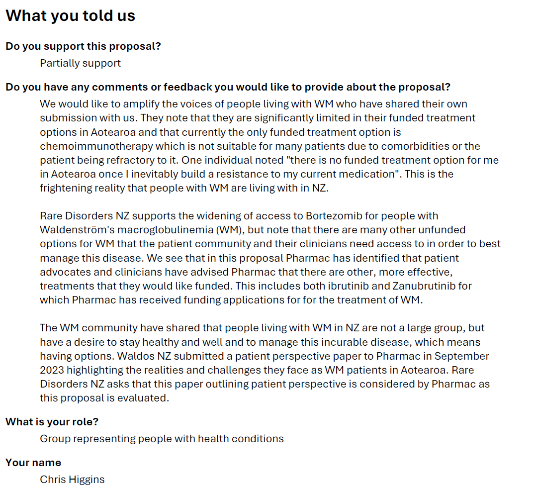Rare Disorders NZ supports the widening of access to Bortezomib for people with Waldenström's macroglobulinemia (WM), but note that there are many other unfunded options for WM that the patient community and their clinicians need access to in order to best manage this disease.